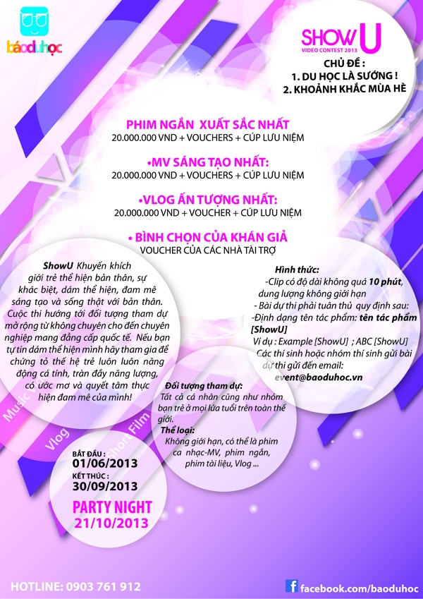 Truy cập vào mạng xã hội của cuộc thi tại đây để biết thêm thông tin chi tiết, hoặc http://www.showu.vn hoặc ZingTV: http://tv.zing.vn/showu-video-contest-2013. |