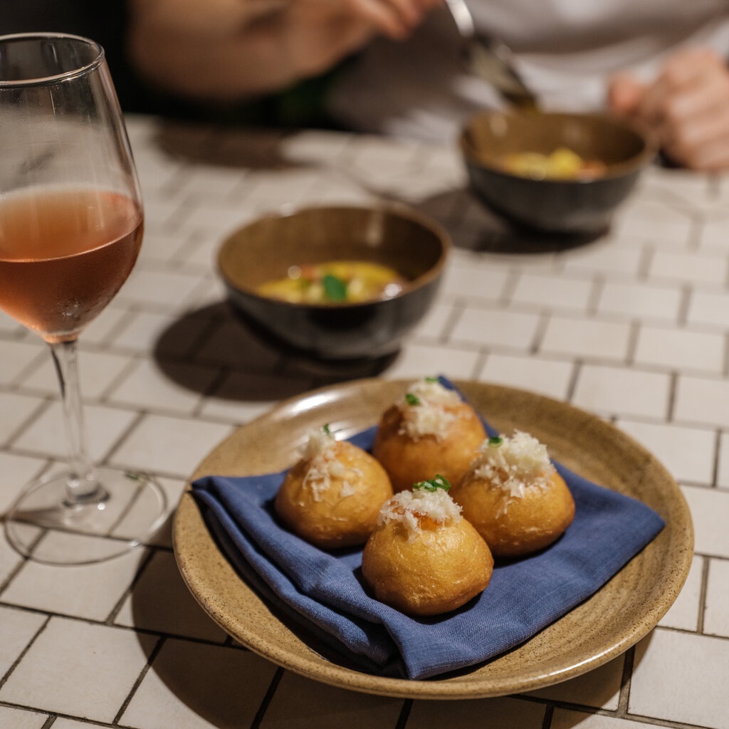 Tại đây, bạn có thể ngồi ngoài trời dưới ánh đèn, bên cạnh ao nước và cây cọ, thưởng thức thực đơn theo mùa gồm nhiều món nhỏ: thịt bê sống thái lát với lá chanh, cá hồng từ Cù Lao Chàm, hoặc món tráng miệng làm từ ca cao Đắk Lắk kết hợp với vỏ quất.
