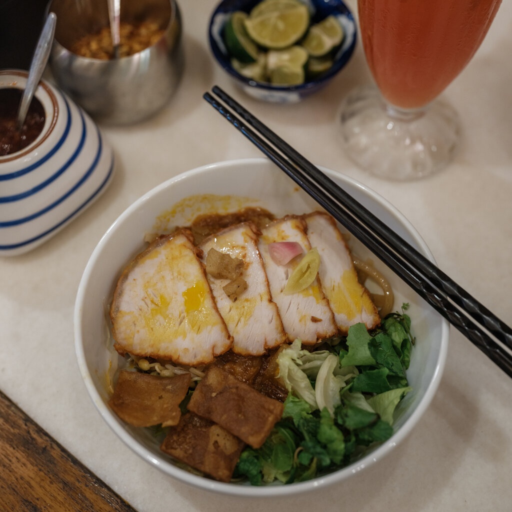 Cao lầu là món đặc trưng của Hội An, với sợi mì dày, thịt xá xíu, da heo chiên giòn, rau sống và nước xốt đậm. Món ăn này được cho là chịu ảnh hưởng từ nhiều nền ẩm thực, phản ánh lịch sử giao thương của phố cổ.