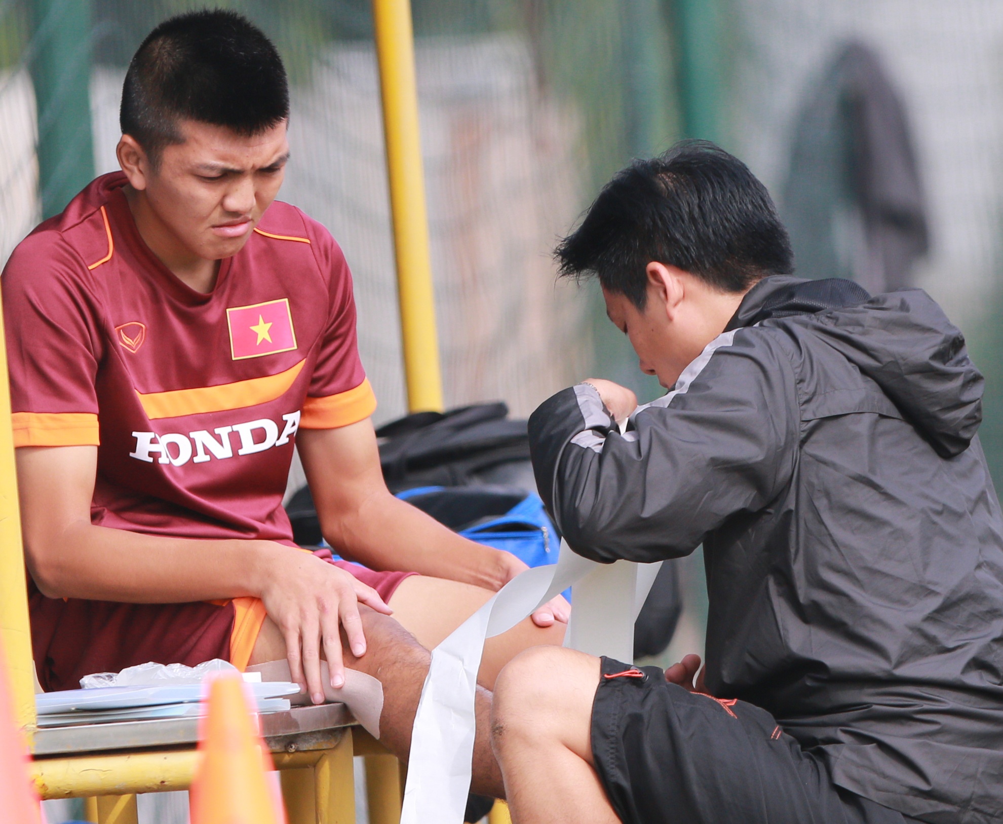 Trong tình huống đối kháng ở buổi tập sáng 11/12, tân binh Dương Văn Khoa nỗ lực đưa chân cản phá một cú sút của đồng đội. Hậu vệ người Quảng Ninh không may bị sút trúng mắt cá, phải rời sân để các bác sĩ chăm sóc.
