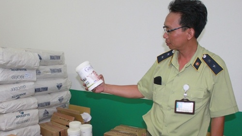 | Lực lượng quản lý thị trường TP.HCM kiểm tra mặt hàng sữa dê GmB tại trụ sở công ty Đại Hùng Tinh. |