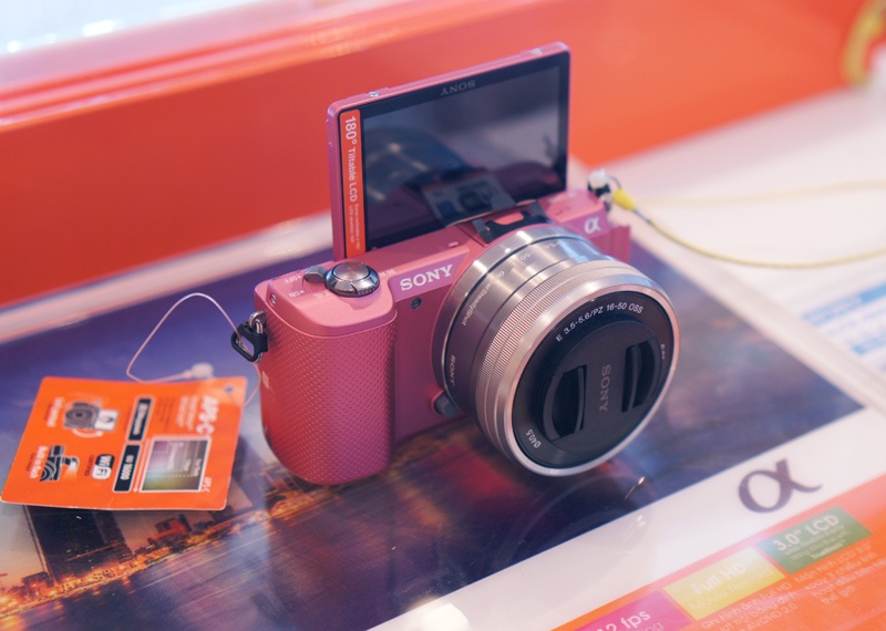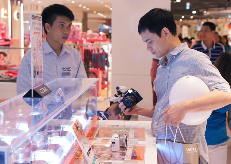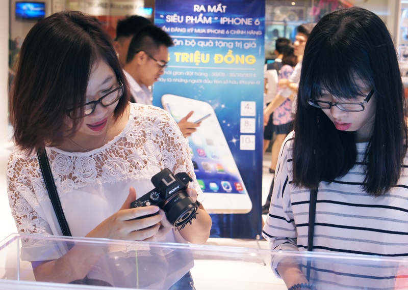 Một khách hàng đang trải nghiệm chiếc Alpha A7R trị giá 35 triệu đồng.