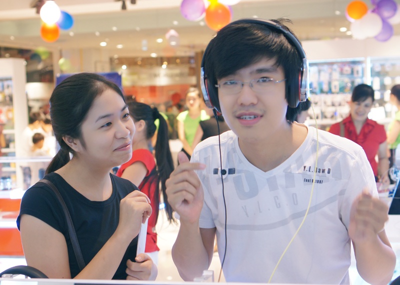2 bạn trẻ thích thú trải nghiệm mẫu tai nghe mới của Sony.