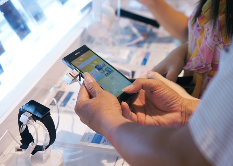 Những sản phẩm được chú ý nhiều nhất vẫn là dòng smartphone Xperia. Trong ảnh là một chiếc Xperia Z1, bên cạnh đó là mẫu đồng hồ thông minh Smartwatch 2 của Sony.