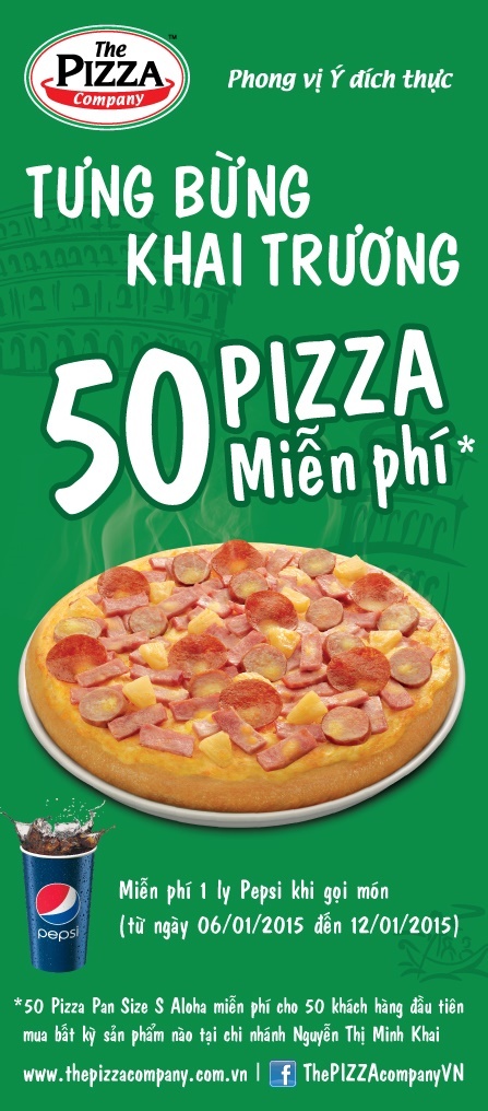 Vào ngày khai trương, ngày 6/1, nhà hàng The Pizza Company sẽ tặng 50 bánh pizza cho 50 khách hàng đầu tiên đến ăn. Bánh pizza tặng là pizza Aloha cỡ nhỏ truyền thống và chỉ dành cho khách đến thưởng thức tại nhà hàng. Ngoài ra còn có chương trình combo cực chất: 1 mì Ý sốt kem + 1 ly Pepsi/ 7Up chỉ 59.000 đồng.