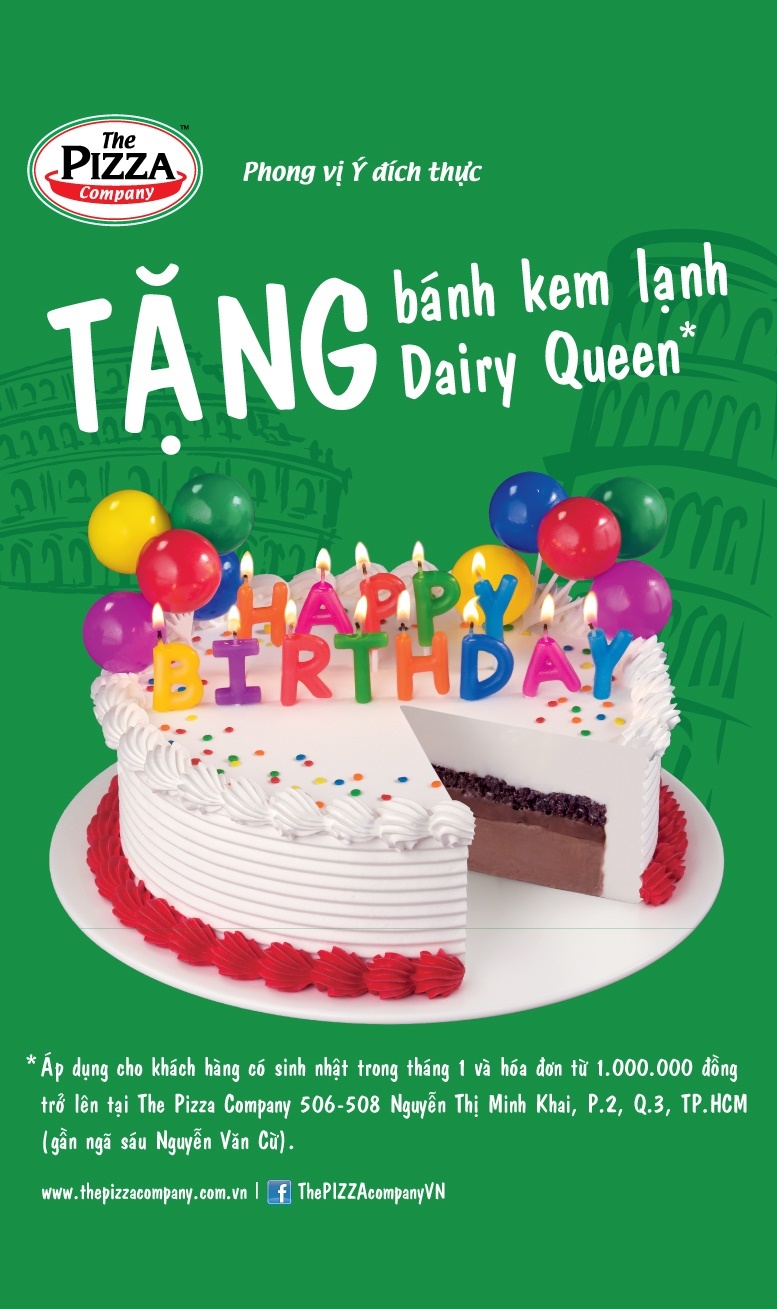 Đặc biệt, vì nhà hàng mới của The Pizza Company khai trương vào tháng 1 nên ai sinh nhật cùng tháng sẽ còn được tặng bánh kem lạnh, tươi ngon Dairy Queen trị giá 290.000 đồngn ếu tổng hoá đơn trị giá 1 triệu đồng! Tiệc tùng với pizza, pasta, tráng miệng bằng bánh sinh nhật kem tươi, còn gì dúng chất Ý hơn nữa cho bạn?