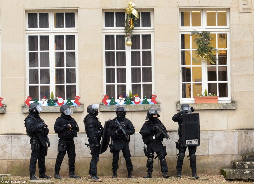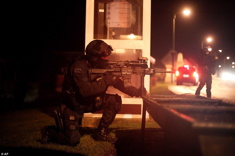 Tại làng Longpont ở Aisne, miền bắc nước Pháp, người ta nhìn thấy cảnh sát vũ trang mang theo khiên chống đạn đang rà soát các khu vực tình nghi. Ảnh: DailyMail |