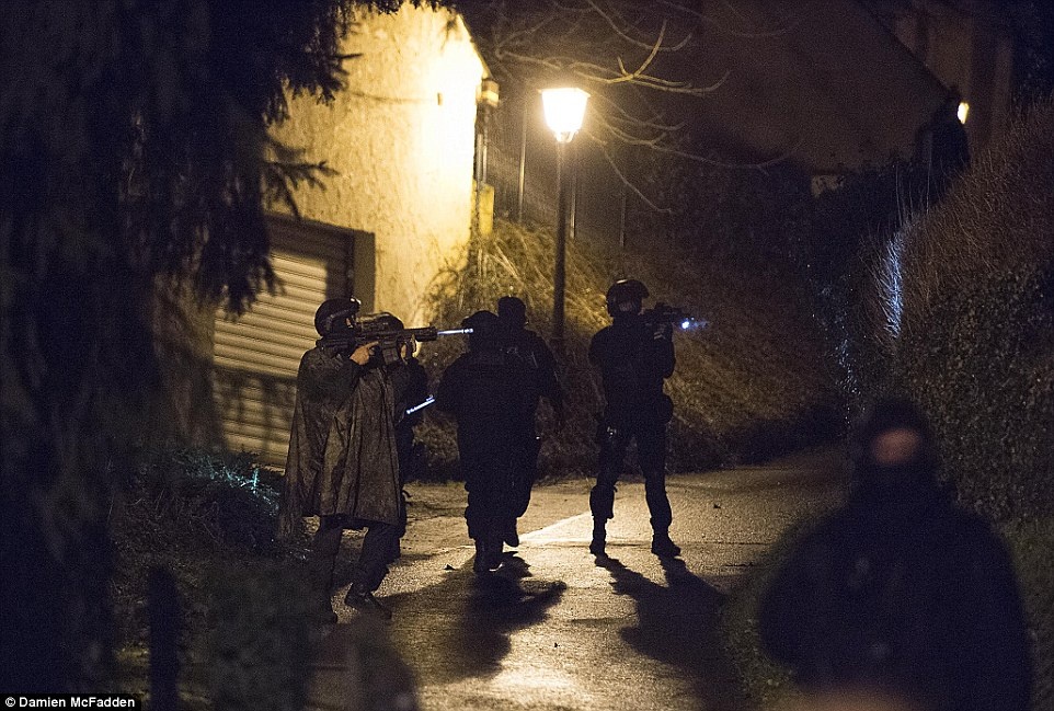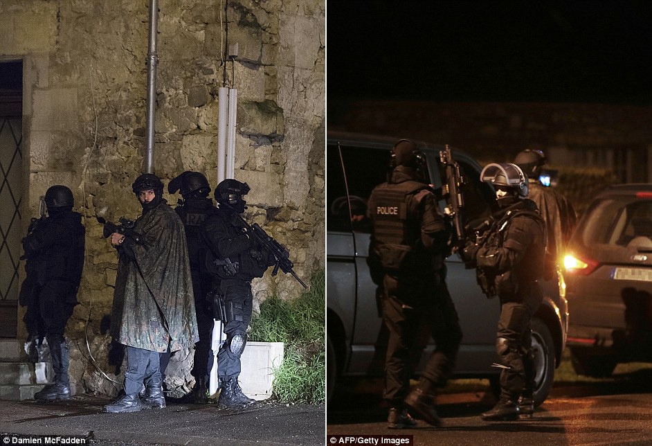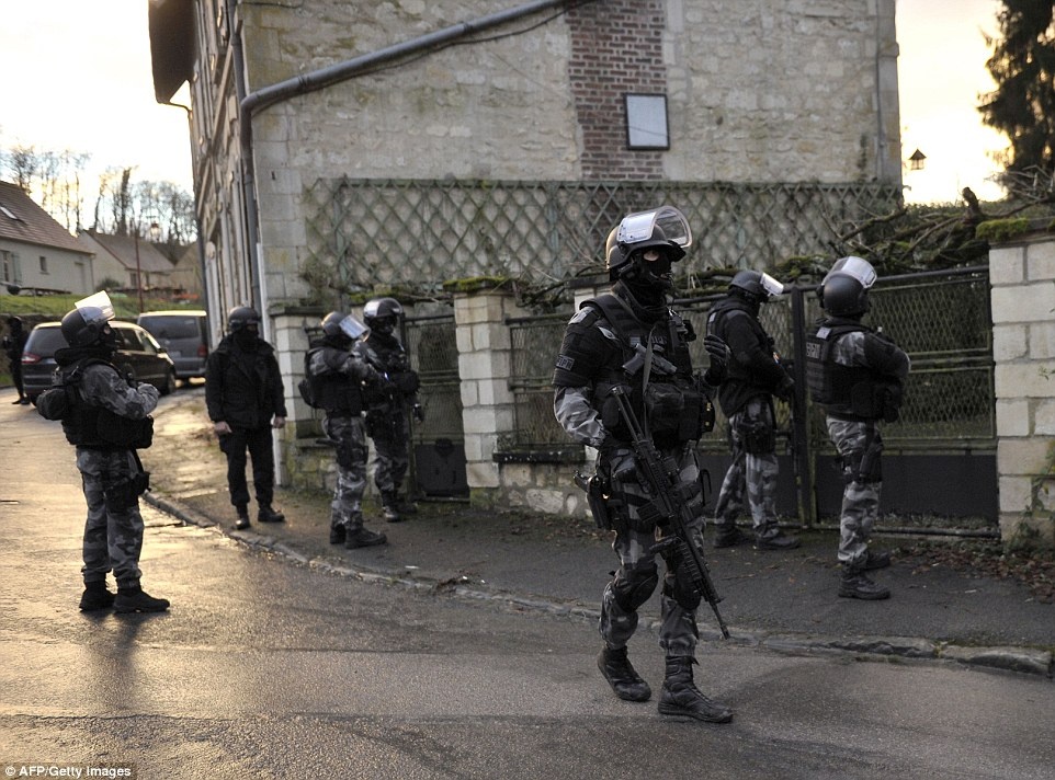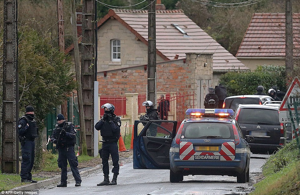 Cảnh sát lùng soát từng ngôi nhà ở khu vực tình nghi nhằm truy lùng tung tích hai nghi phạm sát hại 12 người ở Paris hôm 7/1. Ảnh: DailyMail/AFP |