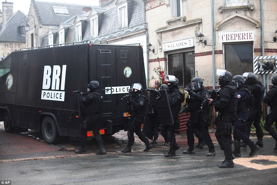 Cảnh sát chống khủng bố di chuyển phía sau một chiếc xe bọc thép chuyên dụng ở làng Longpont. Ảnh: AP |