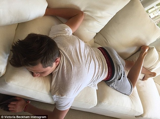 | Hình ảnh Brooklyn mệt nhoài, nằm ngủ quên trên ghế sofa bị Vic chộp lại và đăng tải lên Instagram. "Trở về từ Coachella" - Vic viết. |