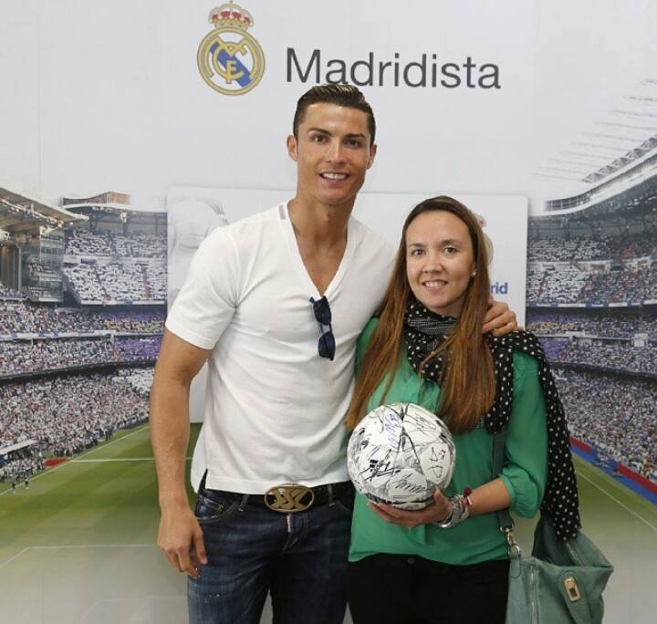| Một fan nữ may mắn chụp ảnh cùng Ronaldo và được anh tặng trái bóng có chữ ký CR7. |