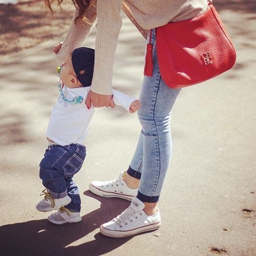 | Con trai Maitre tập đi dưới sự dìu dắt của mẹ. |