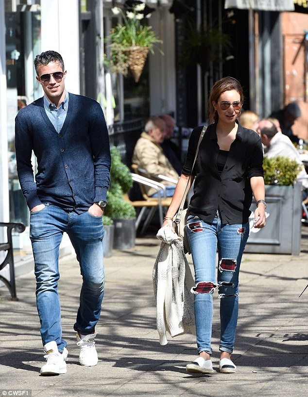 | Robin van Persie cũng nhân ngày đẹp trời, thong dong trên phố Alderley Edge cùng bà xã xinh đẹp. Cặp đôi ăn mặc khá hợp gu với quần bò, áo len mỏng, giày thể thao trắng. |