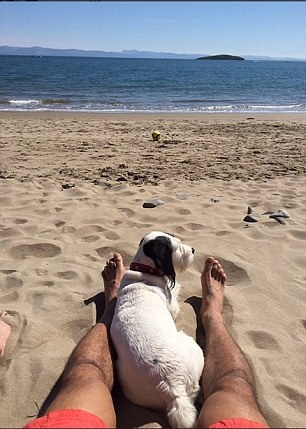 | Chris Smalling cũng khoe ảnh đang nằm dài tắm nắng trên bãi biển cùng chú chó cưng. |