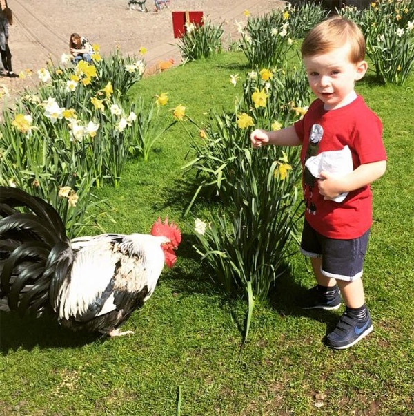 | Klay - con trai Rooney thích thú khi được chơi đùa cùng chú gà trong sân. |