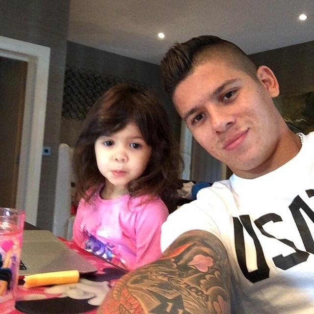 | Rojo chụp hình cùng cô con gái nhỏ. Ngôi sao người Argentina đang trải qua thời gian khó khăn khi bị cáo buộc gạ tình nữ giáo viên thể dục 34 tuổi. |