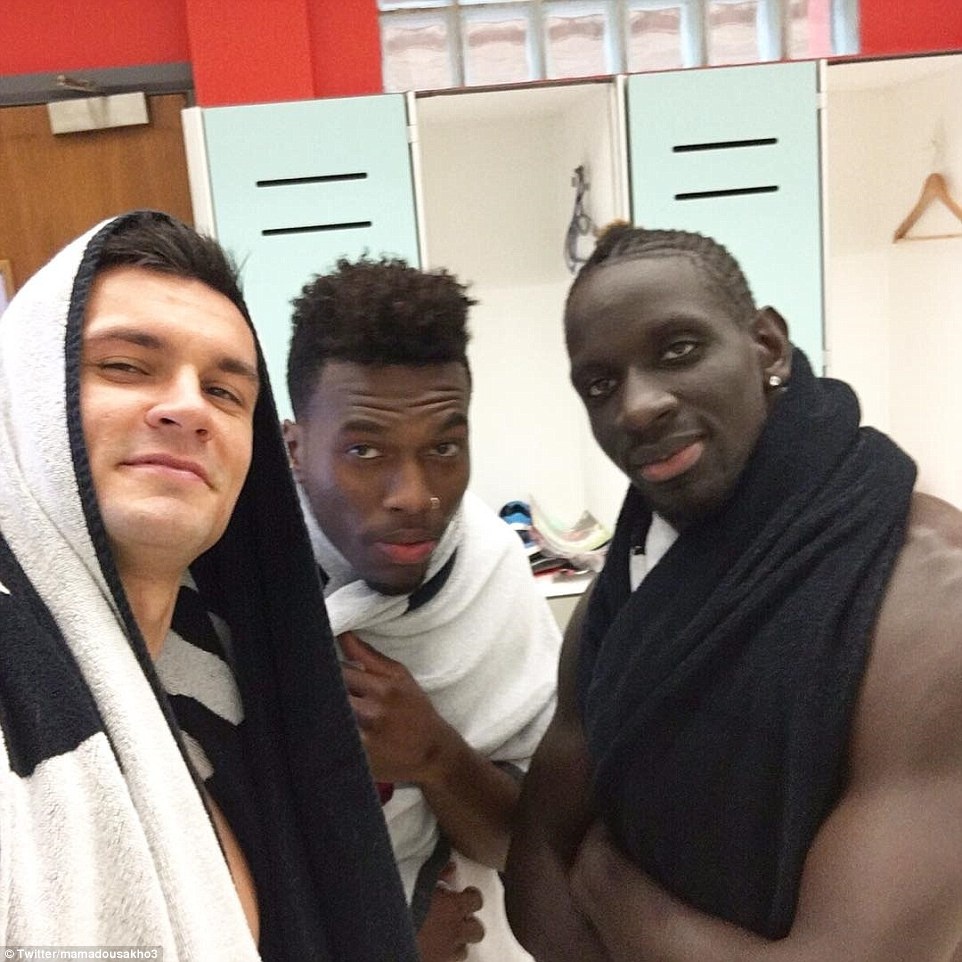 | Dejan Lovren, Daniel Sturridge và Mamadou Sakho chụp ảnh trong phòng thay đồ. |