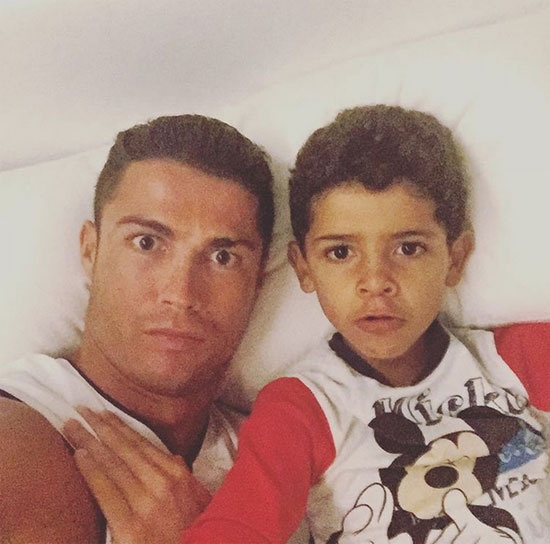 | "Chúc cả nhà ngủ ngon" - bố con Ronaldo hài hước selfie trước khi đi ngủ. |
