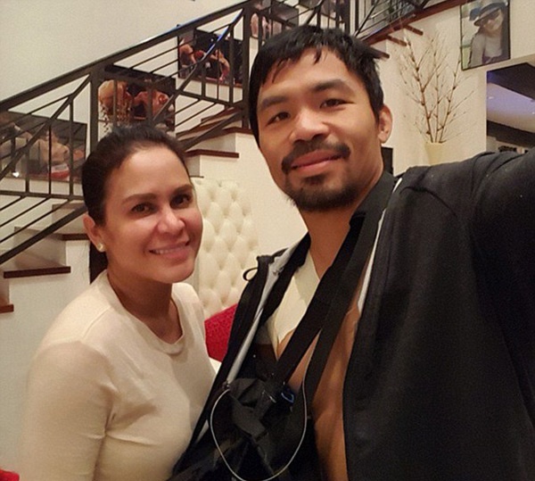 | Paccquao chụp hình cùng vợ sau khi phẫu thuật vai thành công. Tay đấm người Philippine bị thương sau trận boxing thế kỷ với Mayweather. |