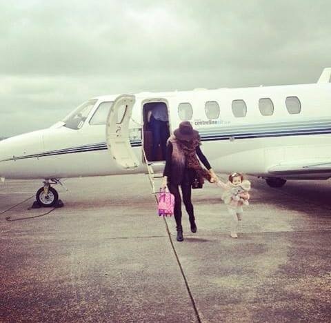| Bà xã của Bale khoe ảnh cùng công chúa nhỏ Alba bước xuống từ phi cơ. |