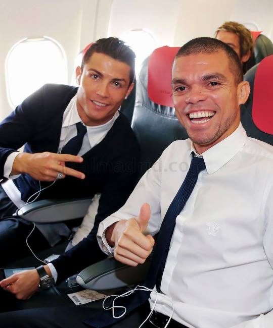 | Ronaldo và cầu thủ đồng hương Pepe vui vẻ chụp hình trên máy bay. |