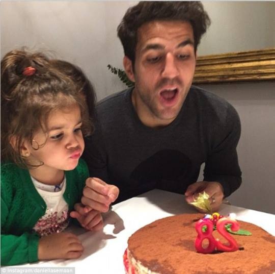 | Daniella Semaan, bạn gái Fabregas chia sẻ ảnh ngôi sao Chelsea đang thổi nến sinh nhật tuổi 28 cùng con gái Lia. "Chúc mừng sinh nhật người đàn ông của tôi', Daniella viết. |