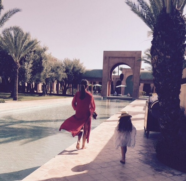 | Harper diện bikini, khoác áo choàng ren đáng yêu bước đi theo mẹ Vic tại Ma-rốc. |