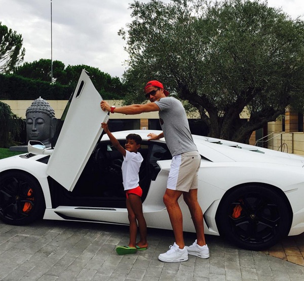 | Ngôi sao Real Ronaldo và con trai thích thú chụp hình bên siêu xe màu trắng. Tranh thủ được nghỉ, CR7 dành nhiều thời gian ở bên và chăm sóc con trai. |