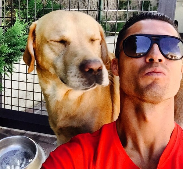 | Ronaldo hài hước chụp hình cùng chú chó cưng. |