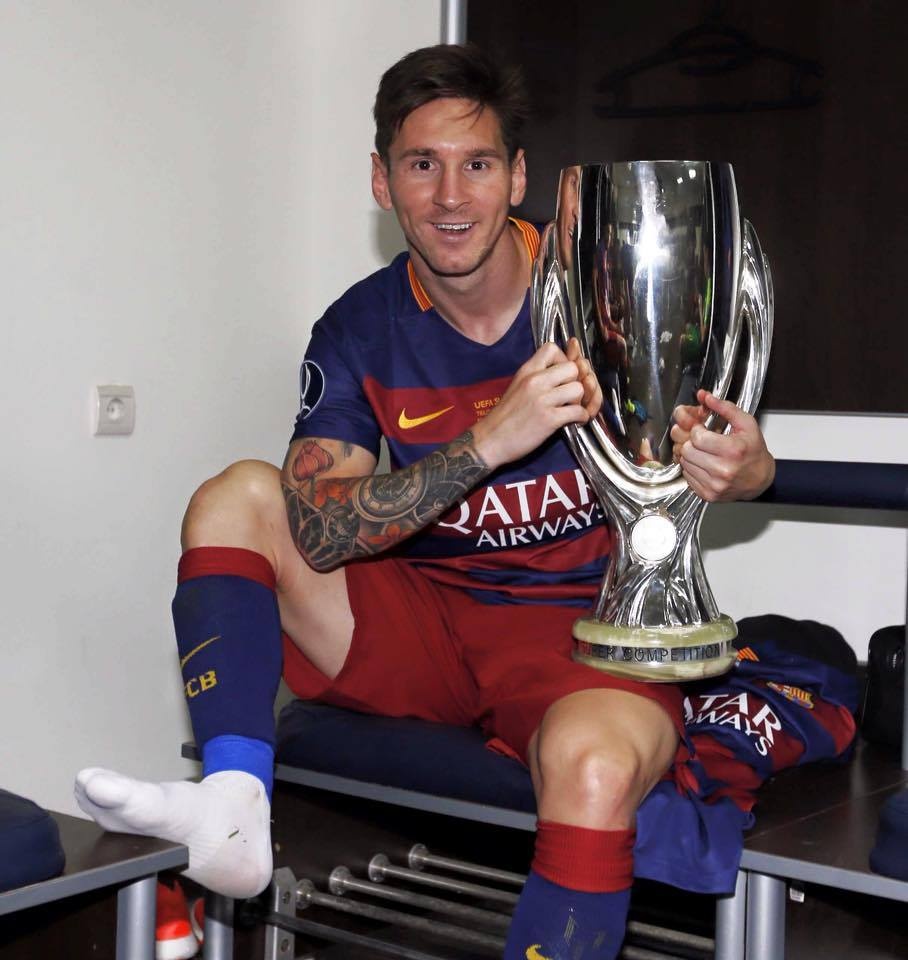 | Messi chụp ảnh ăn mừng chức vô địch Siêu cúp châu Âu ngay trong phòng thay đồ. |