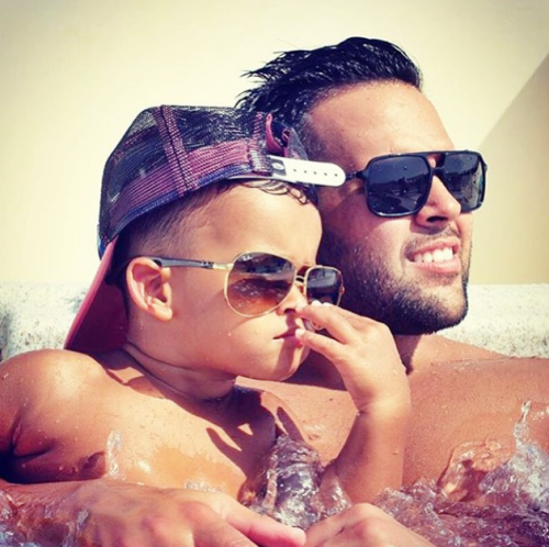 | Bố con Jese Rodriguez tạo dáng "ngầu" bên bể bơi. |