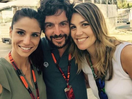 | Nữ phóng viên Lucia (trái) - bạn gái Chicharito cười rạng rỡ bên đồng nghiệp. |