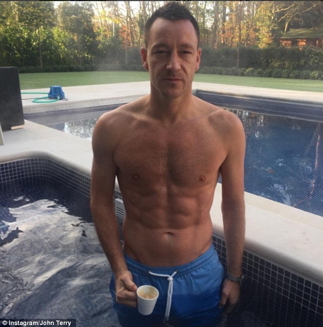| John Terry khoe ảnh cởi trần, thư thái đứng uống cà phê trong bể sục. |