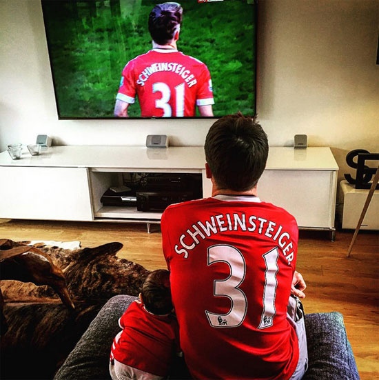 | Anh trai của Bastian Schweinsteiger đăng ảnh đang cùng con trai chăm chú xem em trai thi đấu trong màu áo MU. |