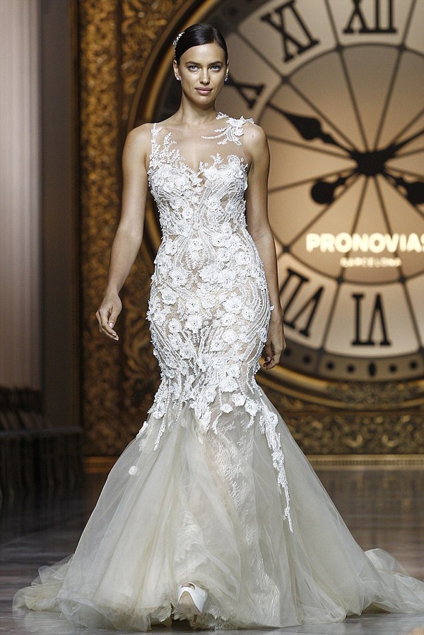 | Siêu mẫu người Nga Irina Shayk - bạn gái cũ của siêu sao Real Cristiano Ronaldo khiến cả sân khấu bừng sáng khi xuất hiện trong mẫu áo cưới mới nhất trong bộ sưu tập Atelier Pronovias 2016 của Pronovias. Những đường cong bó sát cùng thiết kế đuôi công tôn lên nét gợi cảm và sang trọng của người đẹp. |