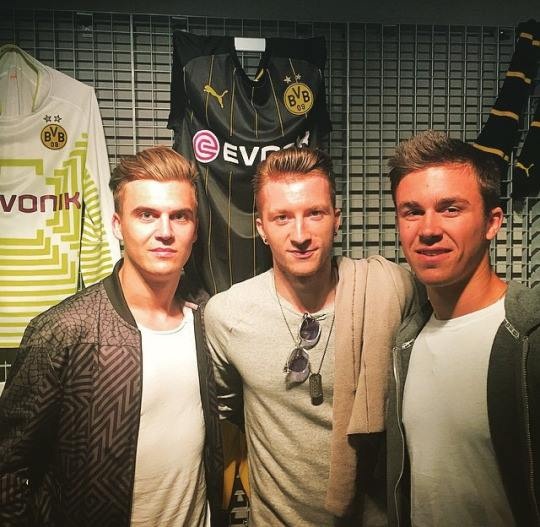 | Marco Reus (giữa) tươi tắn chụp ảnh cùng người hâm mộ. |