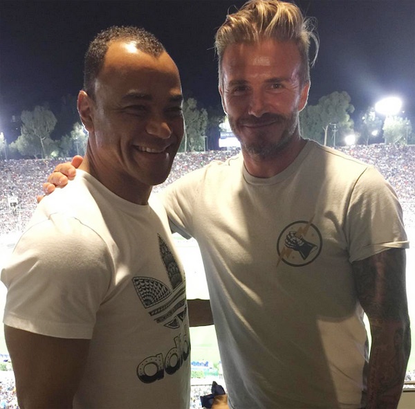 | Tình cờ gặp lại Cafu, David Beckham vui vẻ chụp ảnh cùng. |