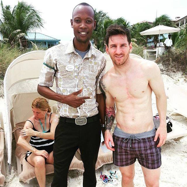 | Messi vui vẻ chụp ảnh cùng một fan trong chuyến nghỉ mát cùng gia đình tại Caribbean. |