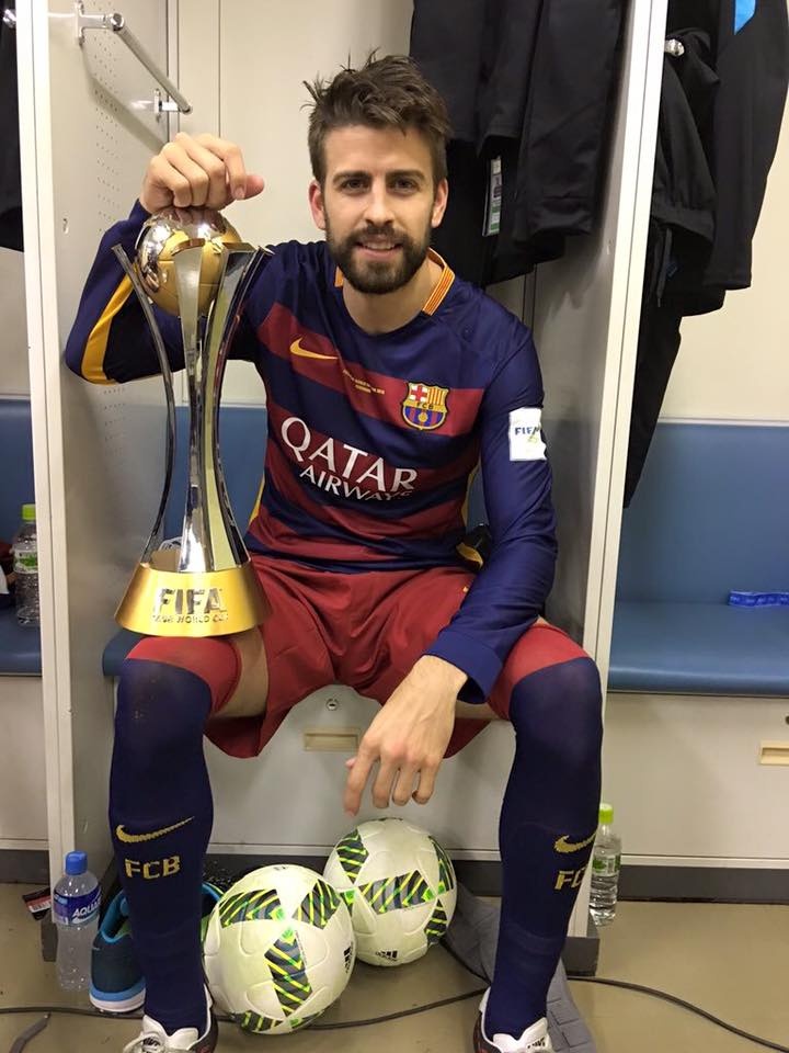 | Pique tự hào khoe cúp vô địch của Barca sau khi giành chiến thắng 3-0 trước River Plate. |