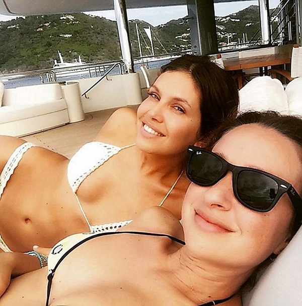 Vợ của tỷ phú Abramovich - ông chủ đội bóng Chelsea đeo kính đen nằm phơi nắng trên du thuyền cùng cô bạn thân Jen Meyer - vợ tài tử Tobey Maguire. |
