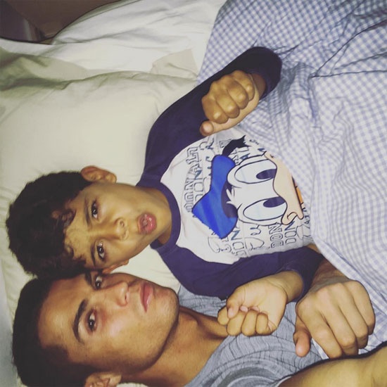 | Ronaldo lạnh lùng selfile cùng cậu nhóc Ronaldo Jr trước giờ đi ngủ. |