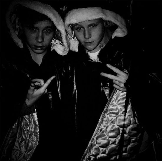 | Brooklyn và người bạn đóng giả ông già Noel trong bức ảnh đen trắng. |