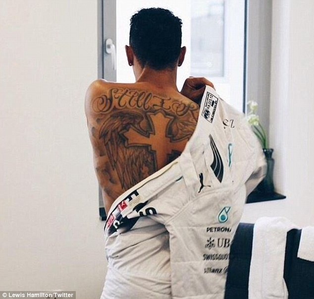 Tay đua F1 lừng danh Lewis Hamilton cố tình để lộ hình xăm mới sau lưng. |
