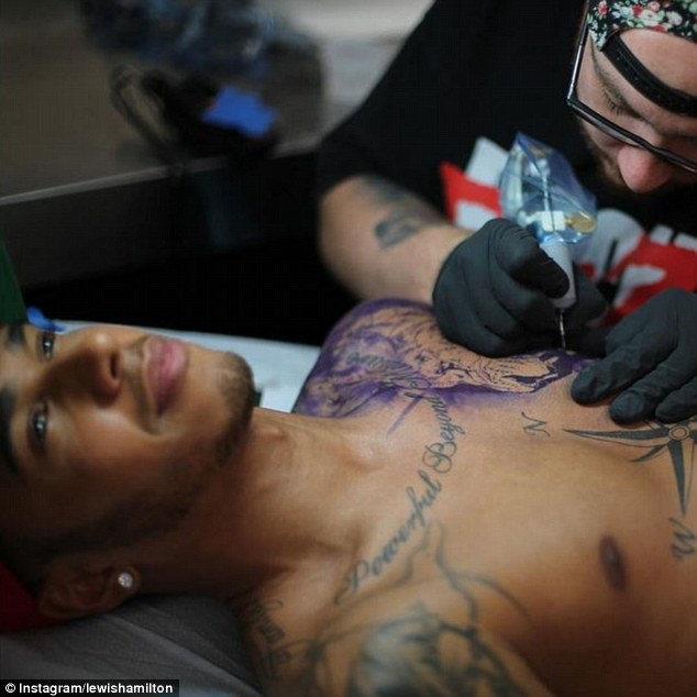 | Trên Instagram, Hamilton cũng đăng tải bức hình thợ đang thực hiện hình xăm trên ngực và vai. |