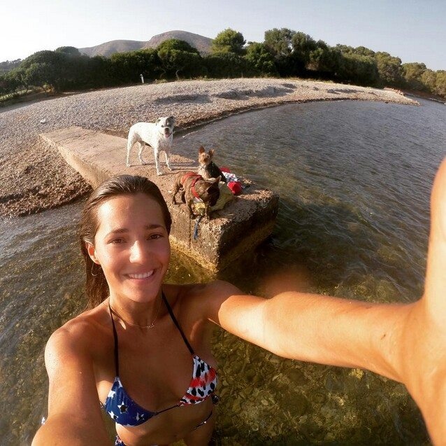 | Người đẹp Melena - bạn gái Suarez (Aletico Madrid) tự tin chụp hình selfie khi đang ở dưới nước. Người đẹp mang theo cả 3 chú chó cưng đi nghỉ mát cùng mình. |