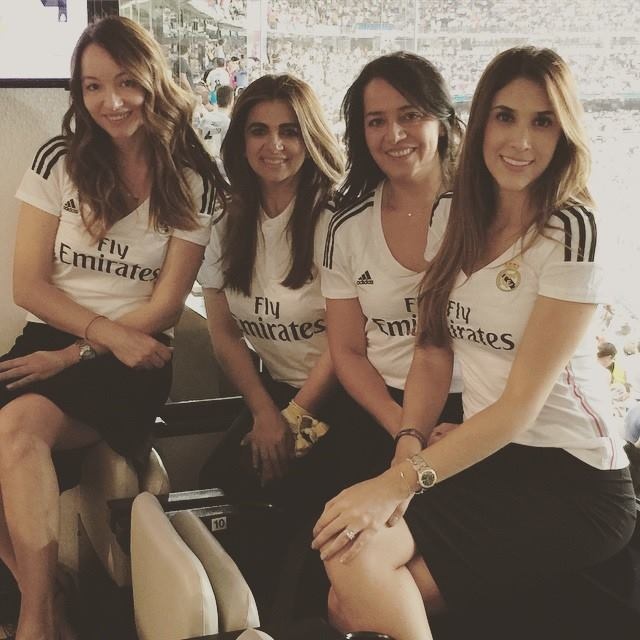 | Daniella cho các nhân viên Spa do cô làm chủ mặc đồng phục áo đấu Real như để cổ vũ cho chồng và đội bóng Hoàng gia Tây Ban Nha. |