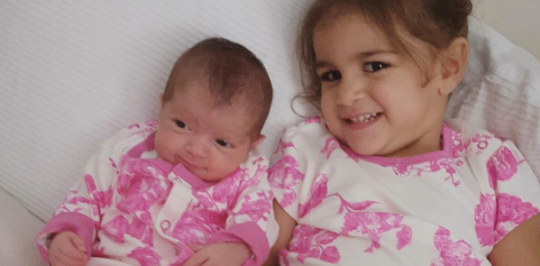 | Hai công chúa nhỏ của Fabregas diện áo đôi màu hồng, cười tươi trước máy ảnh. |