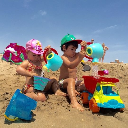 | Hai thiên thần của Valdes nghịch cát trên bãi biển. |