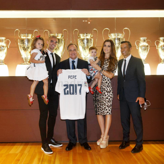 | Danh thủ người Bồ Đào Nha vừa ký tiếp bản hợp đồng tới năm 2017 với Real Madrid. Vợ con Pepe cũng có mặt trong buổi ký kết để ủng hộ chồng . |