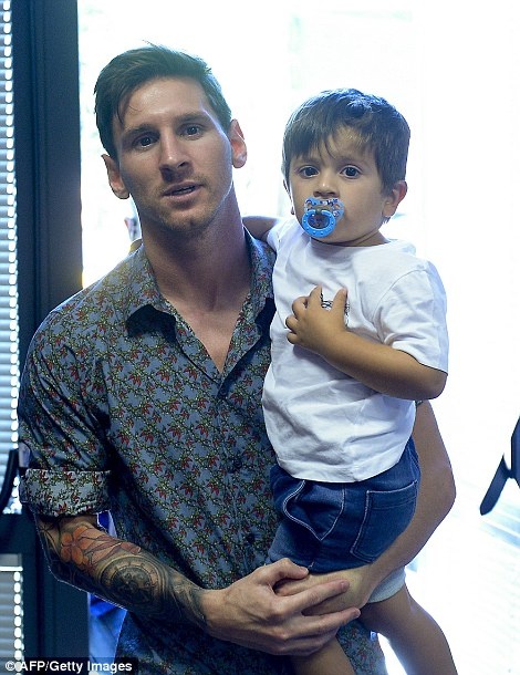 | Messi bế theo cả bé Thiago tới chia tay Pedro. |